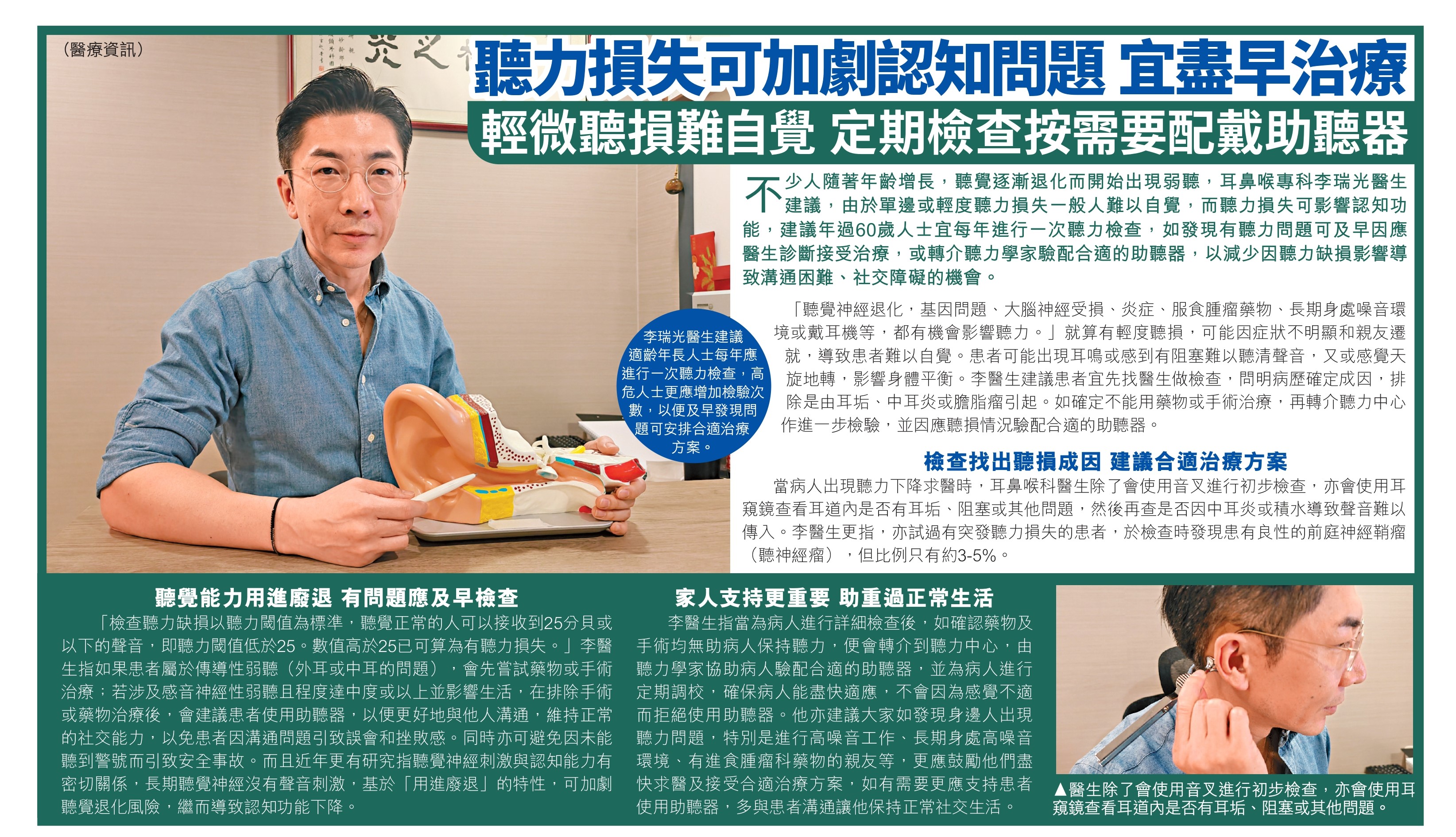 2025-09-30 查看更多年齡增長、遺傳、大腦及聽覺神經受損、慢性炎症、腫瘤科藥物、長期噪音或耳機使用,都可逐步破壞聽覺系統。楷和醫療耳鼻喉科專科李瑞光醫生指出,即使只是單側或輕度聽損,患者亦往往難以自覺,身邊家人亦可能因下意識遷就而忽略問題。