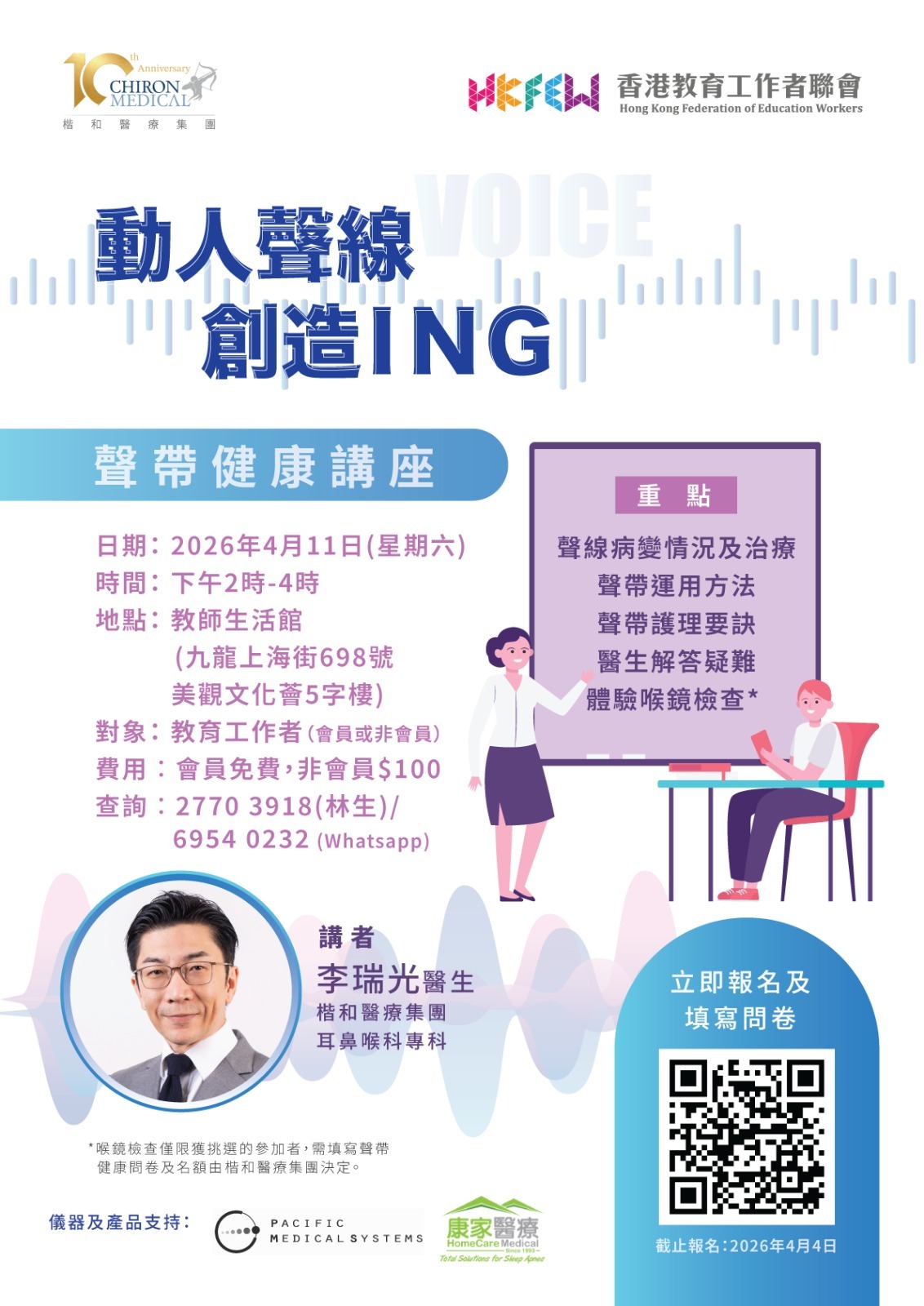 有感一眾教育工作者是其中一種聲沙高風險人士,適逢4月的世界聲線關注日,楷和醫療集團與香港教育工作者聯會將於4月11日舉辦【動人聲線創造ING】聲帶健康講座。由耳鼻喉科專科醫生深入淺出講解發聲原理、聲沙的潛在風險,聲帶病變的治療、提供發聲技巧指導、教授聲線護理要訣、及即席解答長期擾老師的聲帶問題。獲挑選者更有機會以喉鏡檢查聲帶問題。有興趣的教育工作者可透過以下鏈接報名。名額有限,欲報從速。