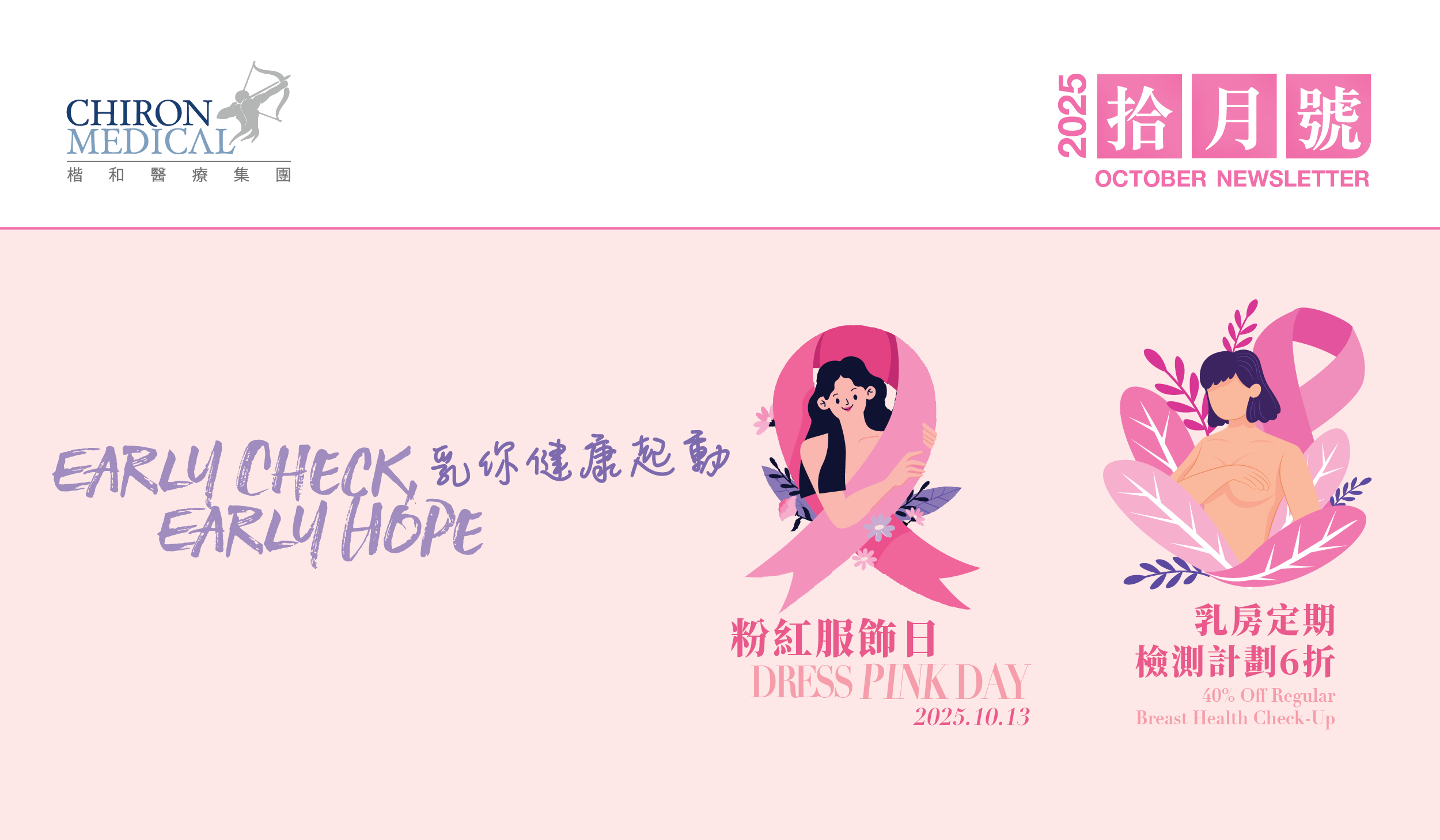 10月是國際乳癌注月,支持粉紅服飾日,關注乳房健康,與粉紅力量同行!凡於10月內自費接受3D乳房X光造影或於粉紅服飾日到診之女士,將獲派發Pink Kit乙份,內含:乳房檢查三部曲、乳癌知識、粉红胸針、贊助機構精選禮品。