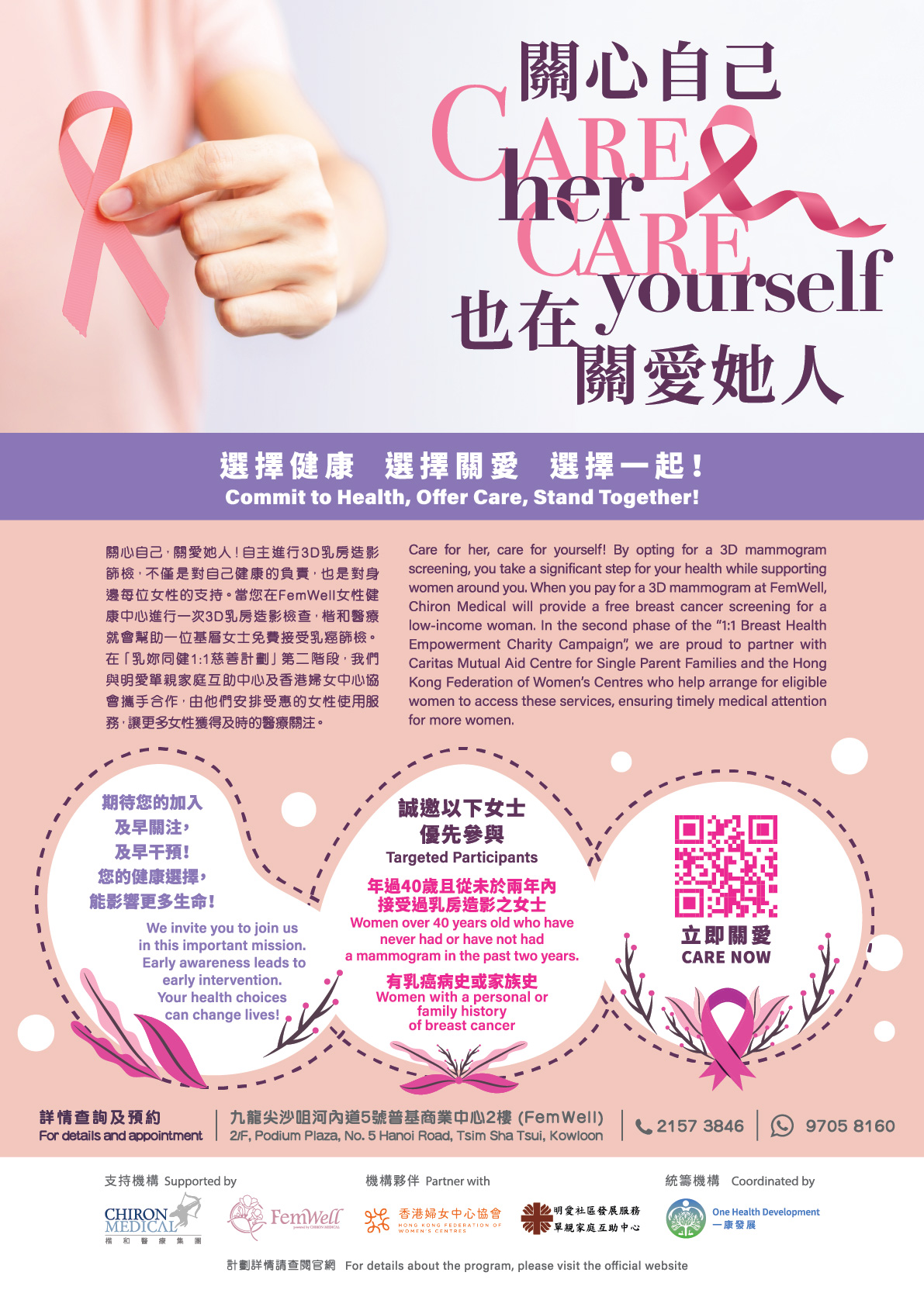 关心自己,关爱她人!自主进行3D乳房造影筛检。不仅是对自己健康的负责,也是对身边每位女性的支持。在「乳妳同健1:1慈善计划」第二阶段,我们与明爱单亲家庭互助中心及香港妇女中心协会携手,让更多基层女性接受乳癌筛检。
