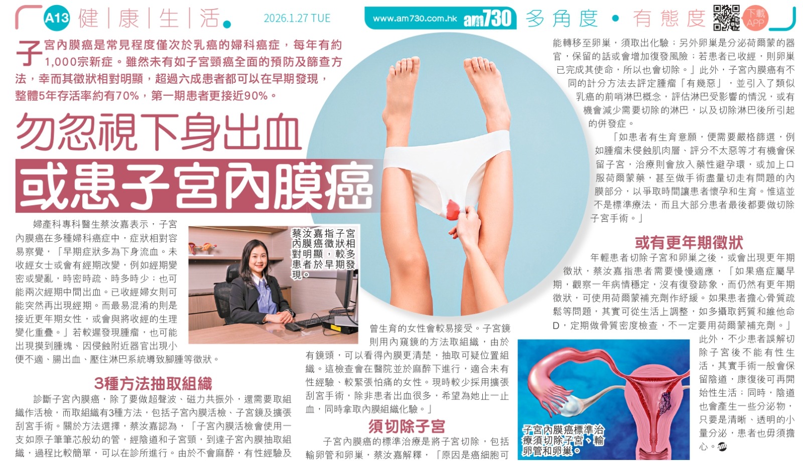 楷和醫療婦產科專科醫生蔡汝嘉醫生表示,子宮內膜癌的症狀比較容易察覺。