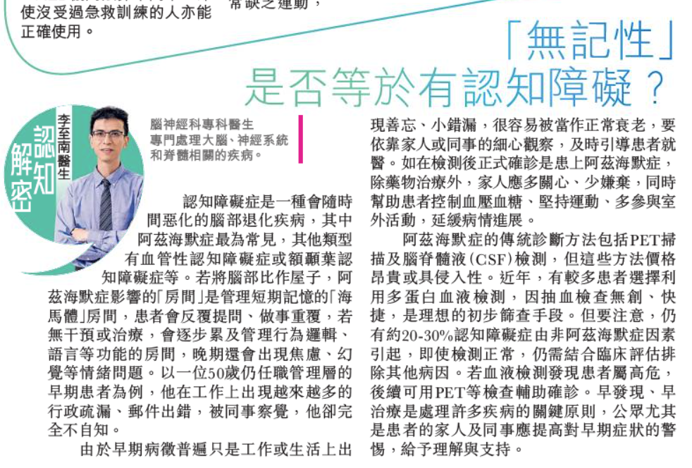 認知障礙症(如最常見的阿茲海默症)是一種隨時間惡化的腦部退化疾病,不僅是「記性差」那麼簡單。楷和醫療腦神經科專科李至南醫生於頭條日報訪問指出,認知障礙症的患者早期會反覆提問、做事重覆,工作或生活上出現善忘、小錯漏。晚期還會出現焦慮、幻覺等情緒問題,跟普通「無記性」不同。